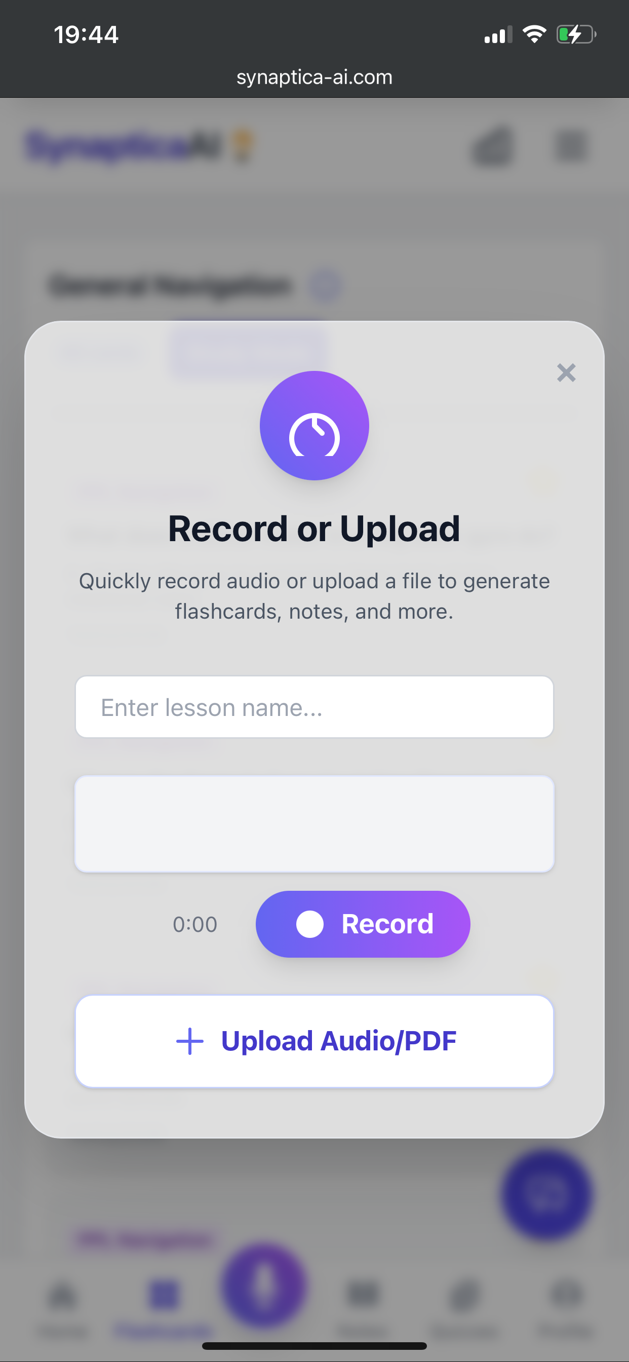 Upload your lecture audio, textbook, or notes from any device. SynapticaAI supports a wide range of formats.
